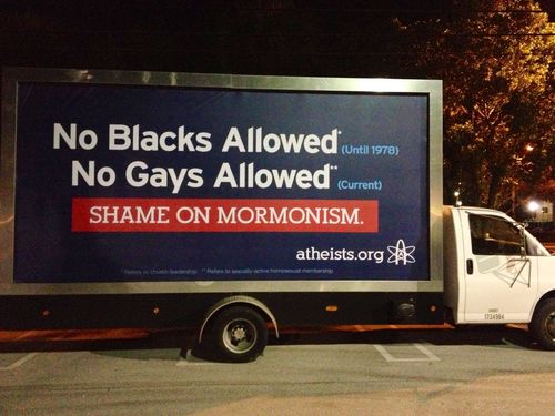 American Atheists have decided to play the Mormon card, since Obama hasn’t. They are now following Romney’s tour bus around with a banner: